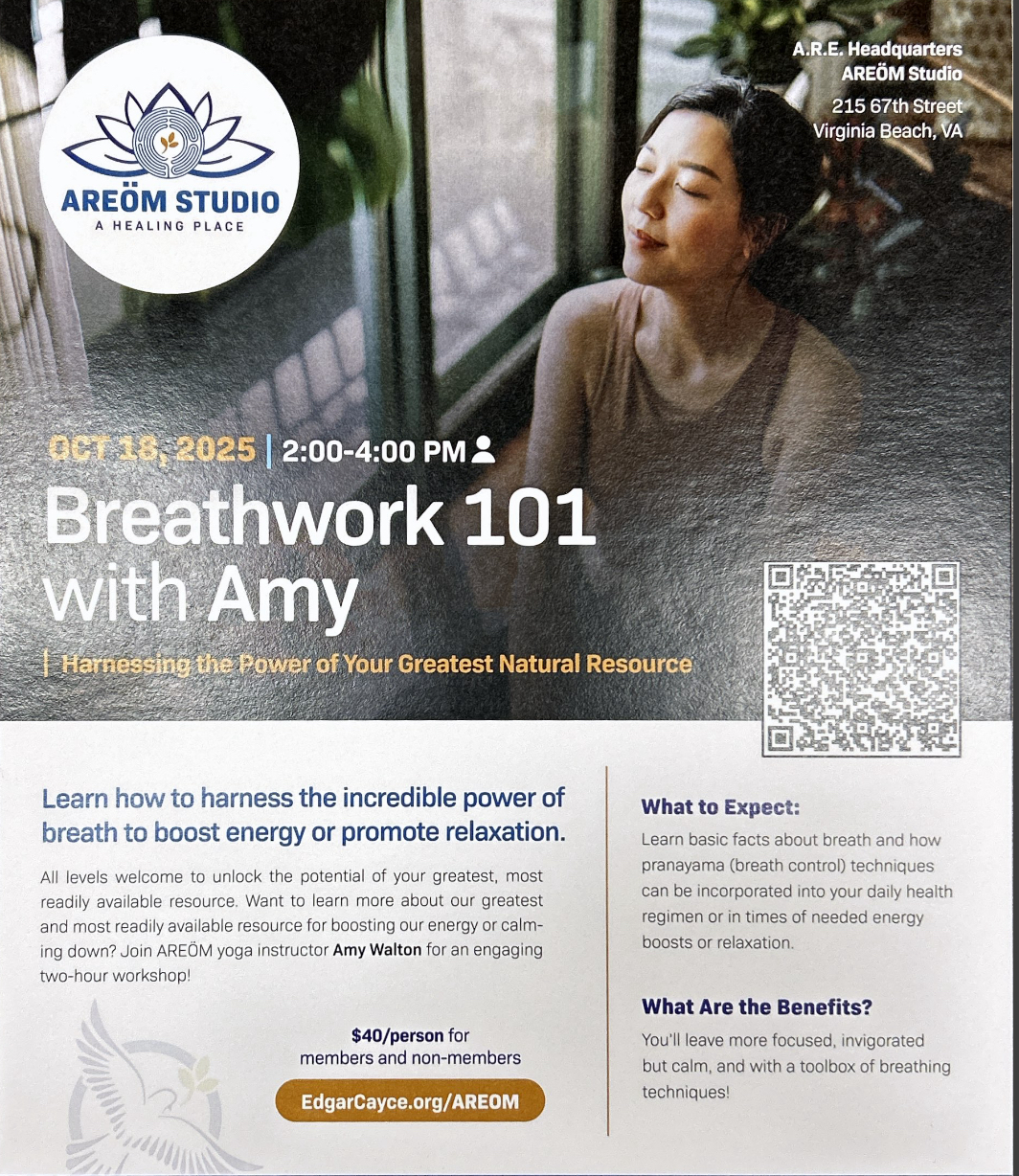 I invite you to join me on October 18 from 2-4pm for Breathwork 101: Harnessing the Power of Your Greatest Natural Resource, at AREOM Studio, located inside the Association for Research and Enlightenment on Atlantic Avenue in Virginia Beach. Watch for details!